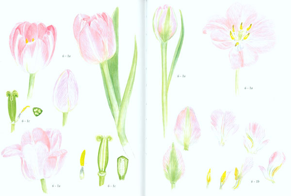 Opposite of this stands the relationship of the pistil with the inner space (figure 6-1c). The pistil of the Tulip is formed by three carpels which have inwardly turned margins grown together in such a way that they embrace an inner space divided into three parts. In the middle of the place where these carpels meet is a column, called a style, from which sprout two vertical rows of seed buds….