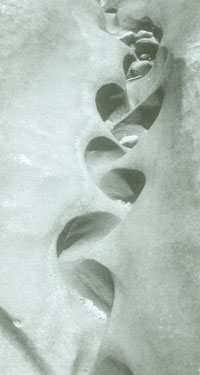 John Wilkes relates in the introduction of Flowforms, the Rhythmic Power of Water, “This book is directed to those people with an open mind, who are interested in our environment and are willing to admit that it is in need of our active support and participation and this, in its own terms…the more subtle aspects which nature is trying to show us, if only we are willing to see.” Our earth is a conscious living intelligence with which we have a reciprocal connection; we are the consciousness of this earth. If we can trust this intelligence, it will teach us what we need to know. This is memoria naturae, nature remembering itself. [Right: Meander channel caused by flowing stream found below a glacier.] We can express through metaphor, our world’s industrialization as “self-regarding ego, intellectual precocity, trust in abstraction and our collapsing pretenses.” (2) An alternative choice is “value rich resonance of participation.” (3)