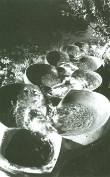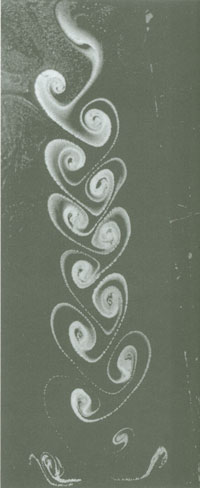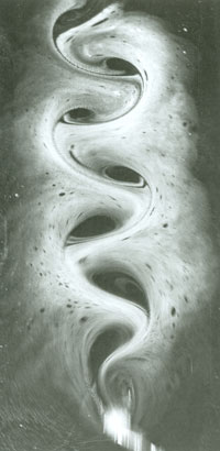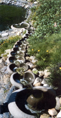 “The path of vortices generated by a straight line movement through still water, demonstrates water’s potential for order and metamorphosis. It is this phenomenon that inspired the idea of building an ‘organ’ of metamorphosis for water, which in turn, led to the Flowform itself.” Special restorative value derives from water features designed in water's own terms…shaped surfaces caressed intimately by flowing, pulsing water. Certainly, this work can sensitize our awareness, while amplifying our experience of water and movement….a mutually beneficial influence. [Left: A path of vortices.]