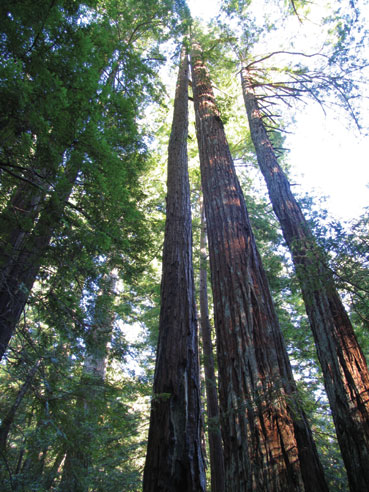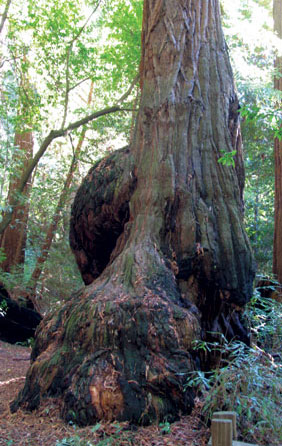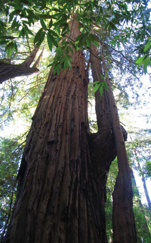 The dynamic life force of the Redwood is demonstrated in its ability to sprout whole trunks from the side of its main trunk. Although these “reiterated” trunks may originate high above the ground, they grow upright as if they were new trees. Dead foliage often collects at the base of these upper trunks, which becomes soil over the decades and centuries, forming an upper ground for other trees and shrubs to sprout and grow.