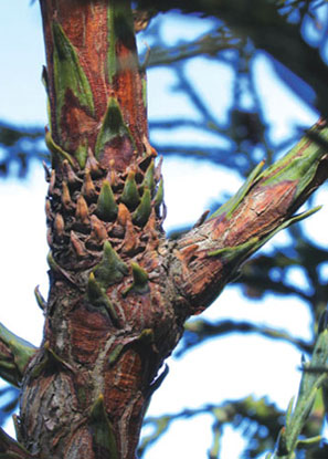 Up in the sunlit crown of the Redwood, the needles grow short and narrow, resembling the needles of cedar or juniper. These leaves make their first appearance growing out of the bark of the upper branches. The scale-like upper leaves are well suited to the hotter, drier conditions found in the forest canopy.