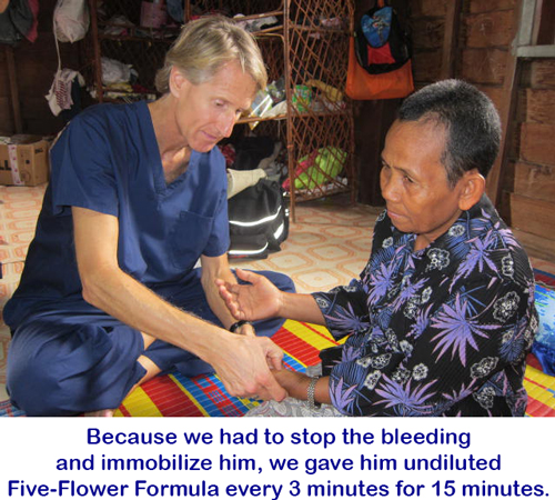 in emergency cases. For example, in the case of a drunk tuk tuk (3-wheel auto rickshaw) driver with a head trauma who climbed to the top level of the 6th floor of a guest house (we do not know how he did that, especially in his drunken state, as the stairs looked more like a ladder). When we found him, he was lying on the floor in a state of delirium, blood spilling all around him and very agitated. Because we had to stop the bleeding and immobilize him, we gave him undiluted