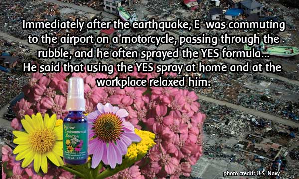 G is a midwife living in Kanagawa Prefecture. Her parents live in Miyagi Prefecture, so her close family, relatives and friends were affected by the earthquake. At the time of the earthquake: She experienced a stronger shock from seeing videos and pictures than during the earthquake disaster. She often remains dazed all day long. Even while working, she feels her heart pound; she cannot stop crying just from hearing things about Miyagi. She feels frustrated and guilty that her hometown, relatives and friends are in terrible circumstances, and she wants to do something but nothing can be done. Her fears about aftershocks and radiation keep growing by the day. During those days, G had been distressed over her job, her children, her parents, etc. So I gave her a formula consisting of Yarrow , Pink Yarrow , Golden Yarrow , Arnica , Echinacea , and Red Clover . She has been taking it since the end of March. Late April: G decided to go home to Miyagi. Since she had a strong sense of anxiety, I told her about the support available from AFEEJ, and gave Fear-Less to her.