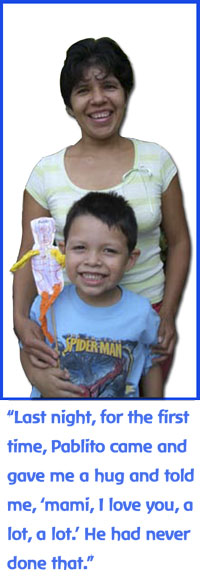 The father is more involved now with Pablo. His mother is not as overprotective of Pablo as she was. They are noticing improvements in his condition. The first day of classes was a happy day for them because for the first time Pablo came back home excited about school, sharing his experiences and also his concern for other children, which he never did before either. They also realized that this time he paid attention to the teacher because he told them what she said and what they should not do. They both were deeply touched, and were able to express their feelings. Although Pablo’s father just said: “Did you heard what he said?” By at least saying this he expresses his emotion and concern for Pablo. It goes to show just how inexpressive he is.