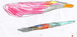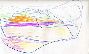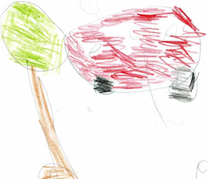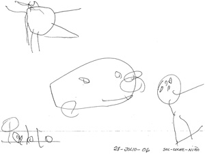 During the first session he did not communicate at all. My goal was to help him find his emotional center and release stressful emotions. The second time he came back he began to slow down a little bit and on the third visit he began to try to speak and listened to a story. After this visit he made a drawing of a dog rather than random lines. His artistic work changed from random lines to specific objects. He can now draw specific objects of interest and love in his world. Later he drew pictures of a house, car, and his father and mother.