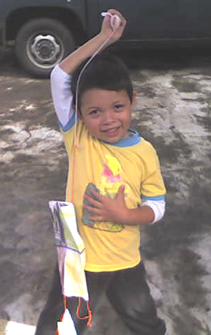 Here is Pablito proudly showing a kite, like he says, “I made all by myself”