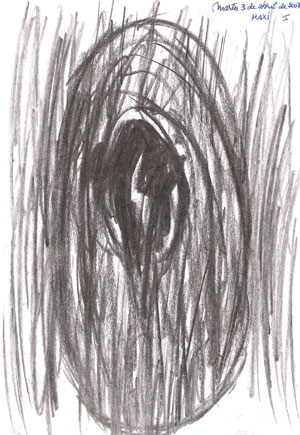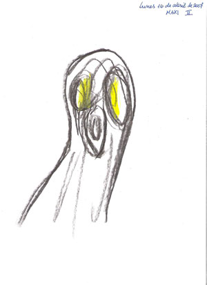 Trapped in darkness and great suffering I met Maxi. He is hand in hand with his mother and does not greet me. They both sit. While his mother talks and talks, Maxi moves his hands compulsively as if fluttering. I give him white paper, crayons and colour pencils. He stops trembling and draws in black his first piece; all of it in black. He then takes his drawing, puts his head back with his mouth open and makes guttural sounds— “OOOOOOOHHHHHHHHHHHHHHHHHH.” In his drawings I perceive he is trapped in his darkness and in great suffering. His first drawing automatically reminds me of the black sketches of “The Scream” by Edvard Munch, that enormous mouth in an “O” shape, sunken in a wild and desperate shout.