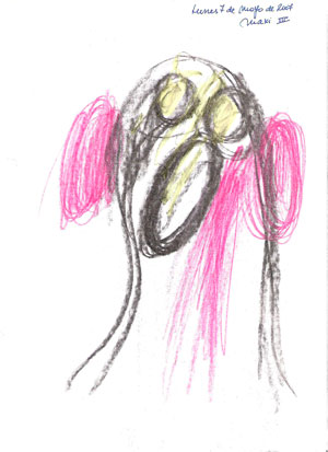 "Now I listen” We had the same basic routine. His mother told me she noticed some soft but very important changes. Maxi grabbed my hand and shook it a little (he is asking for paper and colour pencils). The mother relates having seen him looking through a window; after eating he cuddled in the armchair and was very passive, sleepy and silent. He already had an appointment to visit his psychiatrist. Maxi handed me his third drawing, which follows the E. Munch standards for drawings made by psychiatric patients during stabilization periods. He colours the oval face, mouth and eyes with yellow strokes. Amazingly, in his new drawing, he adds red in the ear zones, which in our communication code tells me, "Now I listen.” Then, he rests his hands on the desk and does not move them until I realized what it meant, and then I placed one hand on his; so he stayed until the end of the session.