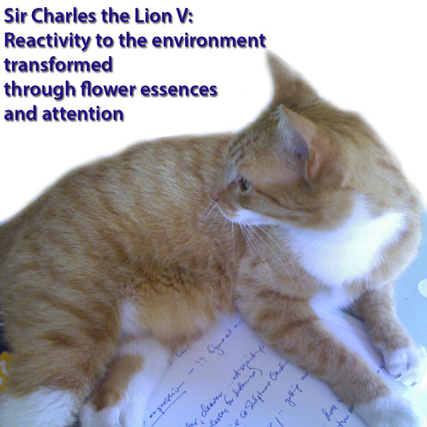 This case was a combination of flower essence therapy and animal communication. Sir Charles the Lion V (“Charles”), a large, 15+ lbs, 8 or 9 year-old neutered male orange tabby cat, had been exhibiting what seemed to his person, JB, to be digestive disorders: vomiting, urinating and defecating in places other than the litter box. Following telepathic communication it was revealed that although Charles had some physical issues in the past, the cause of his inappropriate elimination was a desire and/or need for more of JB’s attention. It was further revealed that Charles was attempting to assist JB in her own desire to open her “vision;” to expand her psychic awareness, by inspiring her to focus more on the here and now. JB was also participating in flower essence therapy at the time. As a result of flower essence therapy, Charles and JB developed a closer, deeper relationship. Charles stopped the inappropriate elimination for the most part, and JB has begun to communicate with Charles on a different level. Adopted as a kitten, survivor of Hurricane Katrina, separation from family, digestive issues