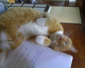 JB had been out of town for a  week;  someone came twice a day to feed the cats and let them  outside. Charles was happy on her return and showed no signs of lack of attention. She also stated that he has not been vomiting nor inappropriately eliminating inside the house. He is “very balanced, centered, happy, in control of his environment and it’s his in a non-forceful way.”  This is in direct relation to JB’s development as well, which is much more focused and calm.