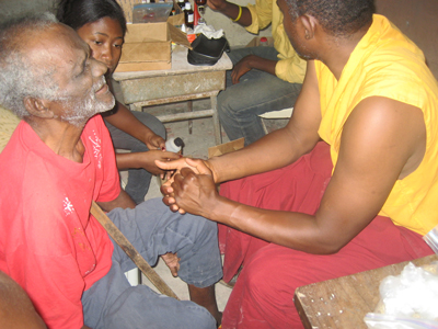 We arise from bed at 5 am, are out of the door at 6, start the clinic at 7 am on site, and return around 5 pm to finally eat. Then we spend the rest of the evening restocking and filling – vials with sugar pills for homeopathics, bottles with oil and alcohol for essential oil blends and flower essences etc. We’re so tired; we sleep like corpses...