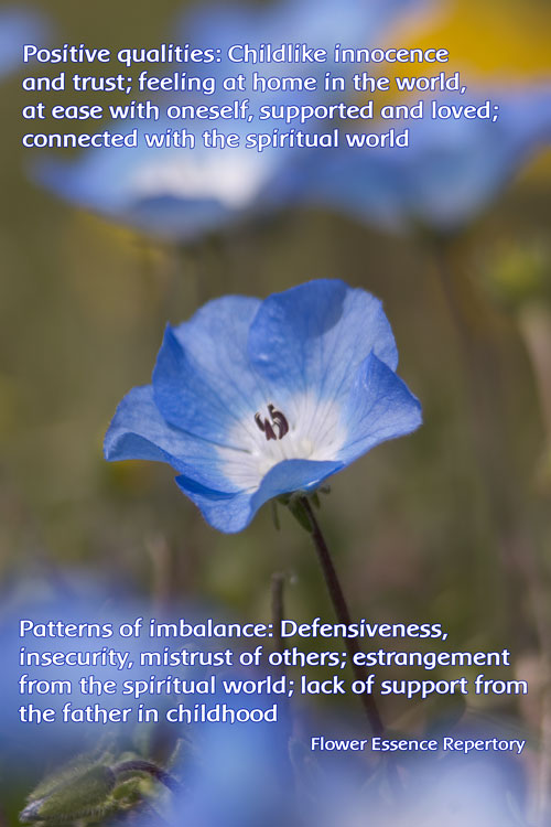 With this first formula, K felt calmer; “I think I’ve been breathing better.” This was due to a softening of negative emotions (anger, resentment and hurt) in which K had been drowning. I believe that here she re-constellated, which was only possible because she got out of her self-centeredness and started a process of self-perception, where she was able to look at herself and realize that she was an extremely reactive person: “I don’t know if I am the one who creates the problem.” I credit these changes to liberation of dysfunctional and excessive energy caused by the flower essences. But, the fact that she felt better and more responsible for the events of her life did not prevent K from talking about her father and appointing him as the great cause of disharmony and lack of love among the people in her family. To her, her father was responsible for all the bad things that had happened in her life. At this moment K had a lot of anger. Her criticism of him and his misfortunes was her opportunity to unload the rancor she kept inside. At some moments, I’d say that her hate towards her father dominated our sessions. I understood that K needed to remake her internal father figure and the way now would be her father’s re-constellation, that’s why I decided to include, from November to March, the following flower essence remedies: Baby Blue Eyes – to restore the father figure by bringing her feelings of safety and confidence to face life. To heal the rejection and abandonment that she had felt since early in life, and for which she blames her father figure, and this way results in cynical and irresponsible attitudes (teenage rebellion).