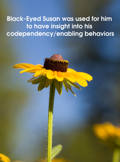 Five-Flower Formula, Willow, Centaury , and I added Black-Eyed Susan for him to have insight into his codependency/enabling behaviors, and Rock Water to help him with his boundaries.