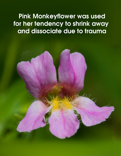 Pink Monkeyflower - To begin treatment for her tendency to shrink away and dissociate due to trauma: "The Pink Monkeyflower type withdraws in a way that is more pronounced than ordinary shyness, for the soul is attempting to cover deeply internalized wounds from the past. Most frequently, early childhood trauma or abuse — or exploitative and debasing experiences at any phase in life — are the hidden factors in such behavior." (Kaminski and Katz, 2003)
