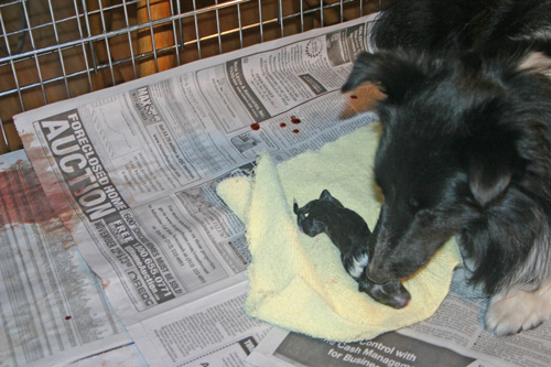Within about 15 minutes of #3 being born, I noticed that he was smaller and weaker than the other two puppies. He did not begin nursing as the other two puppies did.
