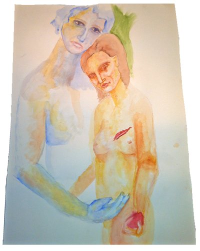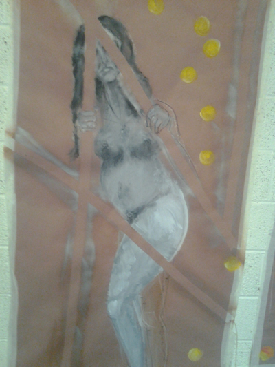 This piece focuses on themes of isolation and rejection. I began by laying pieces of tape across the paper and then painted over it to create a bar-like effect. The bars actually end up being invisible or illusory, which to me spoke to how we can create imaginary prisons or barriers that do not physically exist. The subject is pregnant, and her stance suggests that she is ready to burst forth. In regards to the theme of isolation — I feel it is necessary to be alone in order to really listen to ones self and only then will the individual have something to offer.