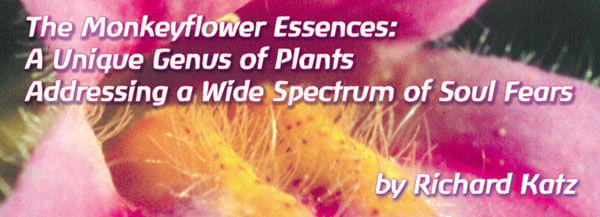 La famiglia botanica delle Scrofulariacee Il genere Mimulus fa parte della famiglia delle Scrofulariacee che comprende inoltre i Penstemon, Indian Paintbrush, Snapdragon e Mullein. In questi fiori non ritroviamo la forma cosmica a stella delle margherite e delle rose, anzi i fiori sono orizzontali, a forma di bocca con una simmetria bilaterale, simile a quella umana o animale, dai colori vibranti. Questi fiori creano uno spazio intimo dove, come negli organi umani o animali, e' possibile contenere e sperimentare le forze dell'anima. Le essenze floreali della famiglia delle Scrofulariacee si rivolgono a quelle emozioni intense, come la paura o la collera, archiviate nei recessi piu' profondi della psiche, e nei corrispondenti organi fisici. Queste emozioni sono descritte come "sentimenti a livello istintivo, viscerale, che vengono dal di dentro" e che sono spesso correlate a disturbi nella regione metabolica del corpo. All'interno della famiglia delle Scrofulariacee, il genere Mimulus - detto anche Monkeyflower (il fiore delle scimmie n.d.t.) - ha un'infinita' di specie diverse (approssimativamente 150 in tutto il mondo, di cui almeno 40 native della California). La caratteristica di questi fiori e' la loro forma a bocca, una "gola" che si allarga in due petali superiori e tre inferiori. Da quattro di questi Monkeyflower provengono le essenze floreali FES, che vengono cosi' ad espandere il tema Mimulus: il muovere attraverso la paura. Proprio come le diverse specie all'interno dello stesso genere sono variazioni di un tema botanico, cosi' le varie essenze dei Monkeyflower esplorano quelle tematiche di paura che si impadroniscono della vita. Questo genere di fiori forma uno spettro di colori: dal rosa, al rosso, all'arancio, al giallo, al porpora che puo' essere chiaramente collegato a specifici centri emozionali nel complesso mente-corpo: