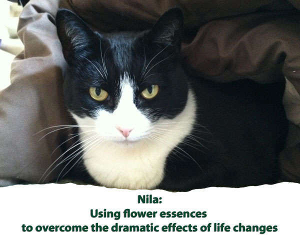 Chamomile for Nila’s digestive issues Genevieve remembered that Nila used to roll in the Chamomile back east, and that Genevieve has also made Chamomile tea and used it as a medicinal herb when she has had a nervous stomach and found it helpful. Since Genevieve, Nila’s owner, had such positive feelings and memories about Chamomile, I decided to start with it. Also, Geni’s first objective was to see if we could get Nila to stop throwing up so much. We took her to the vet, and had her checked out, but they did not find anything abnormal. They said that cats, like humans, get upset and can have eating disorders. Nila seemed to be emotionally upset, in the realm of PTSD from the move and the interfacing with wild animals in her own yard. We wanted her to feel noticed and supported and loved, so she could begin to let go of her state of anxiety, and subsequent depression.