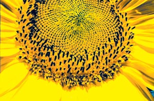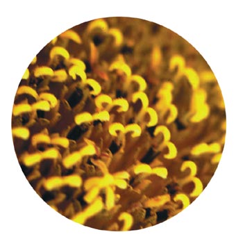 Quello che ci appare come una singola grande infiorescenza è in realtà un vero campo di fiori. Un fiore “composito”, che consiste di una massa centrale di disco flosculo circondato da altri fioretti a raggio che sembrano petali. All’interno di questa intricata mu ltiplicità emerge una singolare legge di totale e geometrica simmetria. In questo schema il ritmo del tempo viene catturato nello spazio. Il suo centro , verde e compatto in origine, cresce verso l’esterno in doppie spirali di fibonacci, intrecciandosi mentre si espandono nella luce. Diventando prima gemme gialle, e poi cerchi di dischi flosculi con punti di luce, mentre gli anelli esterni di stami arcuati inviano la loro essenza luminosa nel mondo. A cingere il tutto troviamo la raggiera di petali lineari che lo incorona con il suo color giallo sole. Essi circondano il disco centrale quindi si incurvano verso l’esterno in tre file distinte, creando una magnifica circonferenza.