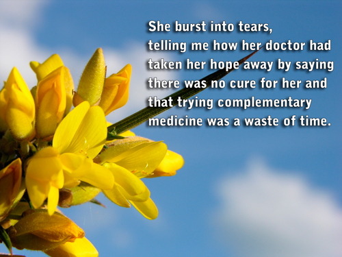 Sue was one of my clients there. When she first came to see me she looked the picture of misery. Her daughter had committed suicide a few years before and in the last year Sue herself had been diagnosed with terminal cancer. At the beginning of the treatment I held Sue's right hand to intuitively test for which Bach flower remedy she might need. When I determined it was Gorse , I asked her if her hope needed strengthening. At that she burst into tears, telling me how her doctor had taken her hope away by saying there was no cure for her and that trying complementary medicine was a waste of time. "If only he had said, ‘Well, you could give it a try,’" Sue wept. "Instead, he has stripped me of my will to live." I wondered what right her doctor had to say that. No doubt, it was based on his experience of Sue's disease. But, even if he was right, surely it must have been obvious something could be done to ease Sue's emotional pain. In such misery, for the first three sessions I had with Sue, she just cried and cried. I had not come across such deep pain before and thought there might never be an end to her tears. Sue said she had never been able to cry when her daughter had taken her life, or even when Sue had been diagnosed with cancer. Now it was all coming out; there were just floods of tears. To match this, during the light touch healing I did on Sue, I experienced huge amounts of healing energy enter her body. At times I felt it entering her with such force that afterwards Sue reported she felt bruised across her chest. This was even though I had not put my hands on her with any more than the lightest touch. Also over those sessions through intuitively selecting various Bach flower remedies, I was able to access deeper aspects of Sue’s emotional pain. It was as though I was peeling the layers of an onion. At first, Sue had loss of hope, represented by Gorse , and then great fear about the future, which was revealed through the remedy Mimulus . This was followed by Pine to help her with regret and forgiveness. Though giving her these remedies in the first three sessions, all I was able to do was hold Sue’s hand while she cried. Finally, on the fourth session Sue’s tears subsided and we could talk. Feeling the relief she had obtained from therapy, after the fifth session, Sue wrote me this letter by way of reference: “The first time I came to Kim she made a good impression on me, because she was so calm and relaxed and interested in people. When she picked a Bach flower for me after holding my hand, and said it was meant for hope, something inside me exploded in my heart and I started to cry. I felt she was the person who could take all of my tears and my heavy problems which I had kept inside me for such a long time. It was a release to let go through a person who was so willing to listen and do something to help me. The vibrations I felt from Kim's hands and from her treatment made me open my mind and heart, and let all the burdens come out. After a time (3 to 4 treatments) I felt more calm and comfortable. The fear was not so difficult anymore. And when she told me about the light and the energy we can get from the great power - maybe God - it was like coming through my difficulties to more hope for the future. One day Kim talked about personality, and what she told me about my Bach flower remedy for this was just like looking at myself through a mirror. Kim's treatment has given me the opportunity to open my mind and my heart. She has given me hope and strength to continue. I feel calm and much more comfortable and optimistic.” It was not only a delight to receive such a letter, but to feel Sue's lightness of being by the end of the last session. I believe the fact that Sue could feel so relaxed and free from her past burdens could greatly help her immune system to focus more fully on fighting her disease.